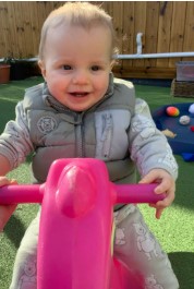 This week in the Baby Room we have been playing on the bikes outside and making marks on the easel with green palm crayons.