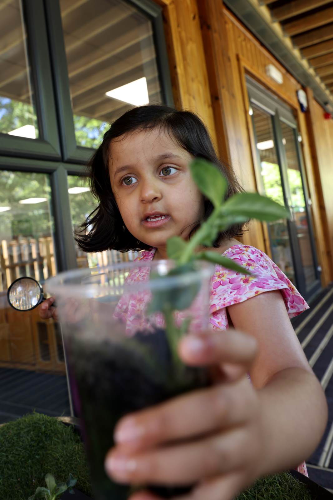 Adults model curiosity and respect for living things, supporting children to handle creatures gently and care for plants they grow. Children learn about growth, change and decay, helping them develop early scientific understanding and responsibility for the environment.