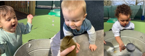 Outside we have been exploring the garden area, listening to the sounds that we can hear outside including cars, trains and birds. We have also been filling and emptying containers in the mud kitchen.